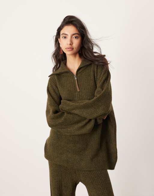 Jersey caqui extragrande con media cremallera y solapas de canalé de ASOS EDITION (parte de un conjunto)