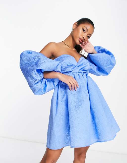 Vestido corto azul texturizado con escote Bardot y mangas blusón de ASOS EDITION