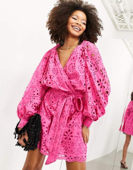 Vestido corto rosa luminoso con bordado inglés, diseño cruzado y cinturón de ASOS EDITION
