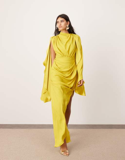 Vestido largo amarillo verdoso con mangas extragrandes y diseño fruncido de satén de ASOS EDITION