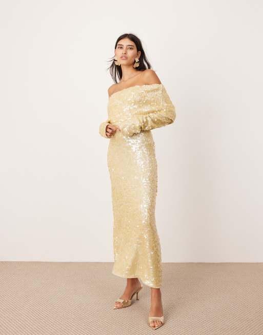 Vestido largo color crema de punto con escote Bardot y diseño de lentejuelas de ASOS EDITION