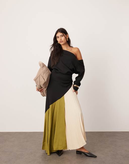 Vestido largo con diseño color block, hombro caído y detalles plisados de ASOS EDITION