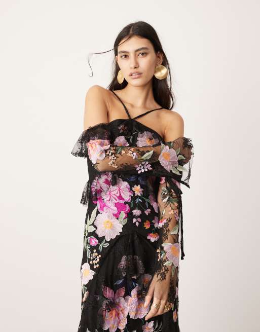 Vestido largo negro con hombros descubiertos, volantes, bordados y cuello halter de ASOS EDITION