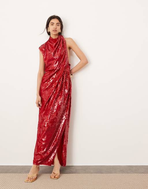 Vestido largo rojo drapeado y holgado sin mangas con cuello halter de lentejuelas de ASOS EDITION