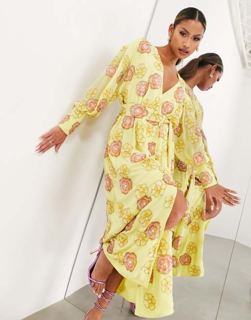 Vestido midi amarillo cruzado con estampado floral de lentejuelas de ASOS EDITION