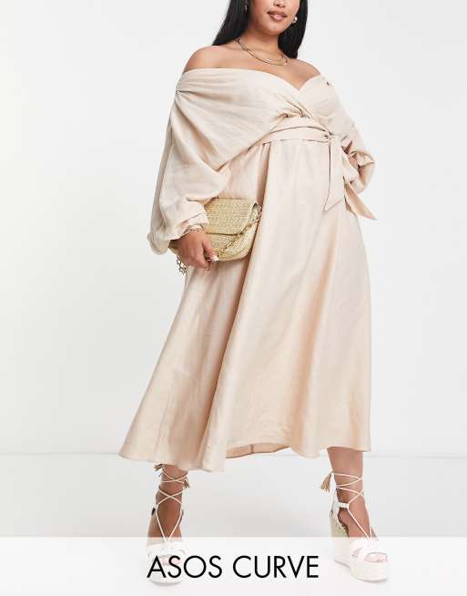 Vestido midi color piedra cruzado con detalle elástico en la espalda de lino de ASOS Edition Curve