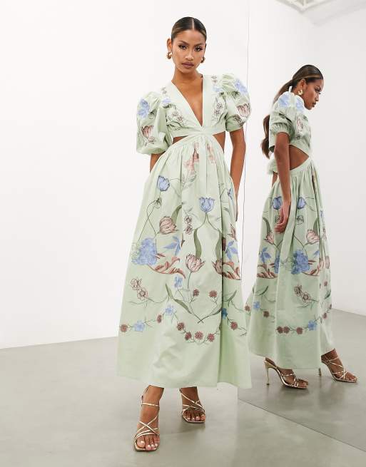 Vestido midi verde salvia con mangas abullonadas, abertura y bordado floral de ASOS EDITION