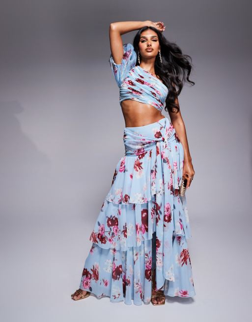 Conjunto azul de top y falda larga escalonada con estampado floral y volantes de organza de ASOS LUXE