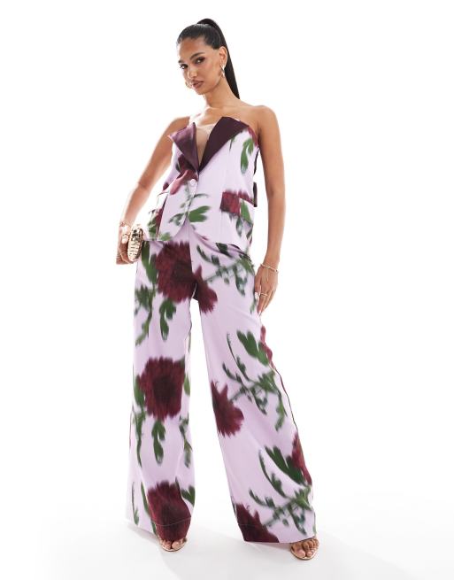 Conjunto con estampado floral difuminado de pantalones de traje de pernera ancha y americana de sastre con escote palabra de honor y lazo de satén de ASOS LUXE