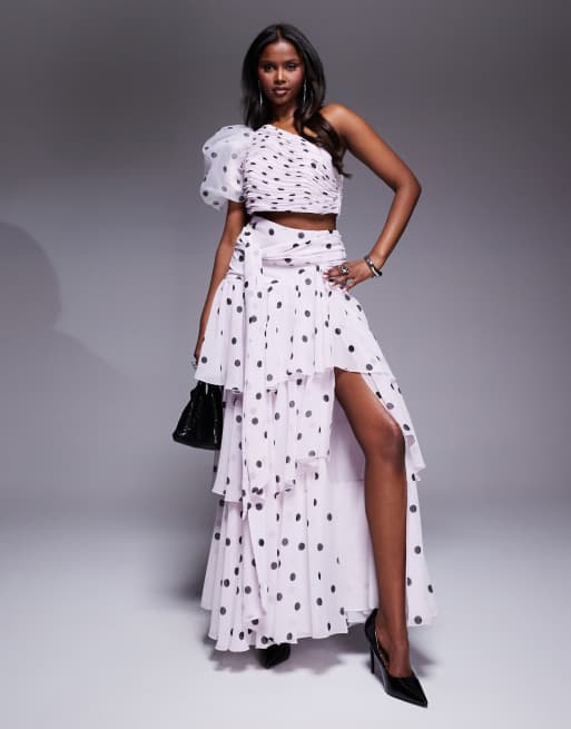 Conjunto de falda larga con volantes y top asimétrico con mangas estilo blusón y estampado de lunares de organza de ASOS LUXE