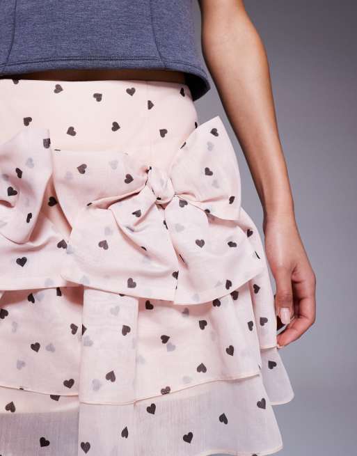 Conjunto rosa de minifalda con lazo en la parte delantera y top estilo babydoll con mangas blusón voluminosas y estampado de corazones de ASOS LUXE