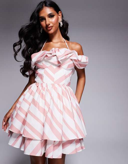 Vestido corto a rayas rosas de corte skater con escote palabra de honor y acabado fruncido de popelina de algodón de ASOS LUXE