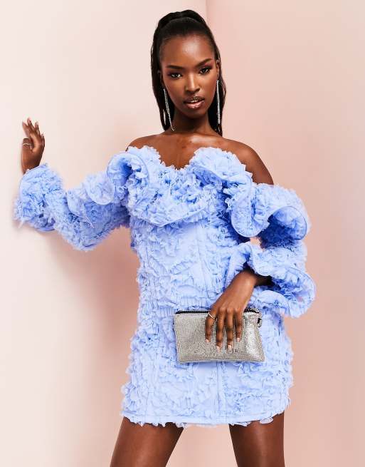 Vestido corto azul con escote Bardot y volantes de encaje 3D de ASOS Luxe