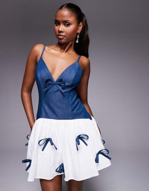Vestido corto azul de cambray con detalle de lazos y falda de popelina en contraste de ASOS Luxe
