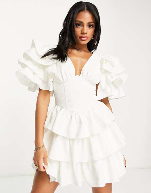 Vestido corto blanco estilo corsé con volantes en las mangas y el bajo de jacquard de ASOS LUXE