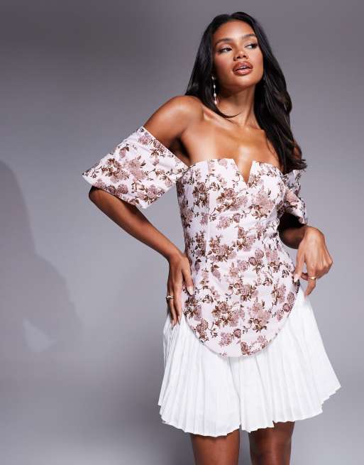 Vestido corto con patrón floral de jacquard estilo tapete, escote Bardot y falda plisada de popelina de ASOS LUXE