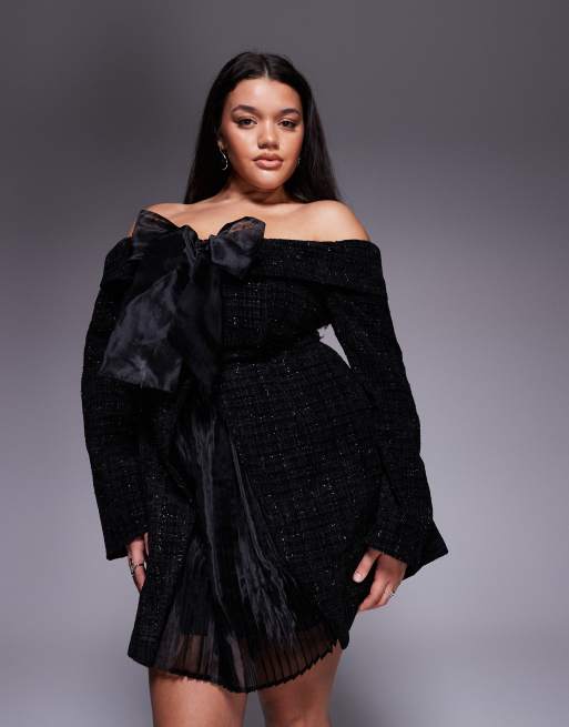 Vestido corto negro con escote Bardot, lazo y falda plisada de bouclé de ASOS LUXE Curve