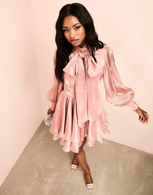 Vestido corto rosa polvareda de corte skater de manga larga con lazada al cuello de satén de ASOS LUXE