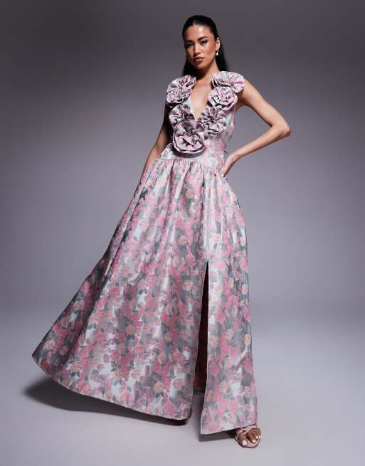 Vestido largo escotado con cintura baja, estampado floral de jacquard y flores de ASOS LUXE