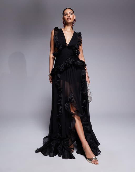 Vestido largo negro escotado con espalda abierta y detalles fruncidos de chifón de ASOS LUXE