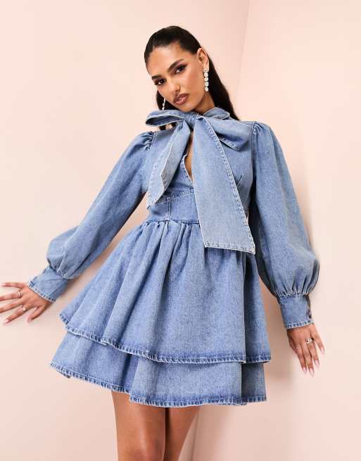Vestido vaquero corto azul de corte skater con lavado medio y lazo de ASOS LUXE