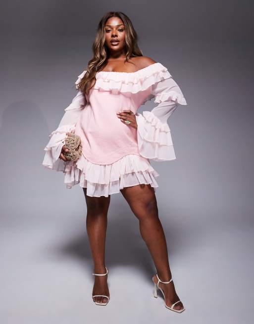 Vestido vaquero corto rosa estilo corsé con mangas y bajo de chifón de ASOS LUXE Curve