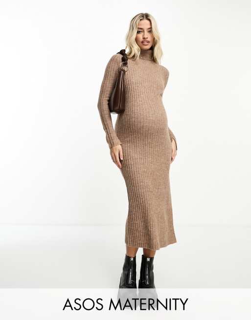 Vestido largo color camel con cuello alto y abertura lateral de punto de ASOS DESIGN Maternity