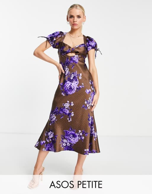 Vestido de tarde midi con parte delantera retorcida y estampado de lunares y flores de satén de ASOS DESIGN Petite