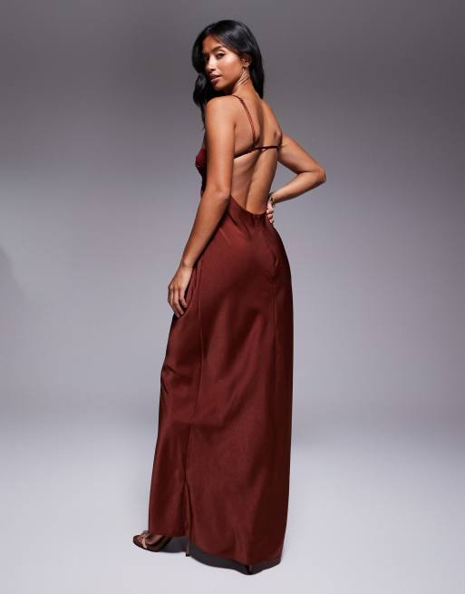 Vestido largo color canela con cuello halter de tirantes y pecho en contraste de satén de ASOS DESIGN Petite