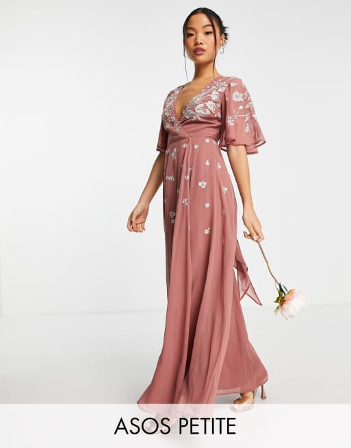 Vestido largo de dama de honor con bordados florales, cintura cruzada y mangas acampanadas de ASOS DESIGN Petite