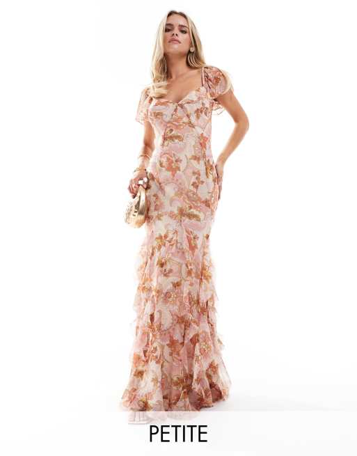 Vestido largo rosa con mangas fluidas, godets de volantes y estampado floral de ASOS DESIGN Petite