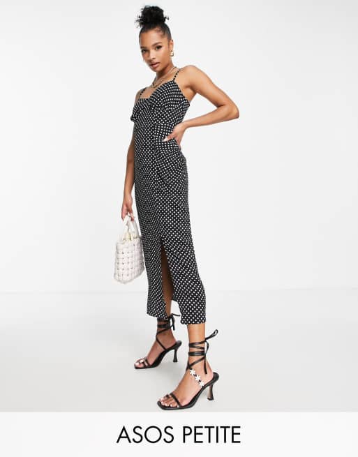 Vestido midi monocromático de tirantes con estampado de lunares, copas en el pecho y abertura de ASOS DESIGN Petite