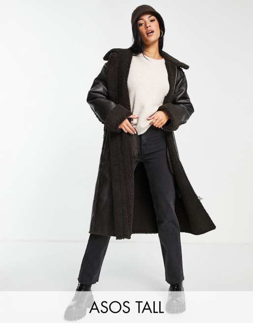 Abrigo largo marrón oscuro con solapas reforzadas de borreguito de ASOS DESIGN Tall