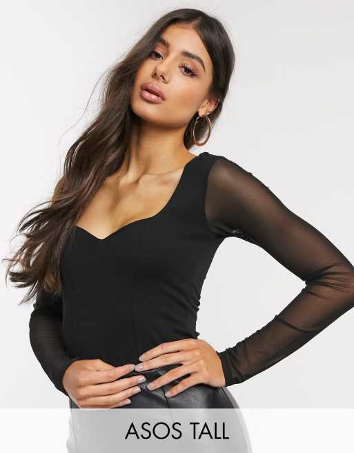 Body con escote de corazón y mangas de malla en negro de ASOS DESIGN Tall