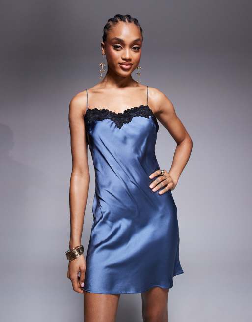 Vestido corto azul acero de tirantes de satén con detalle de encaje de ASOS DESIGN Tall