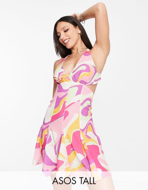 Vestido corto en tonos luminosos de tirantes con estampado ondulado y falda de godets de ASOS DESIGN Tall