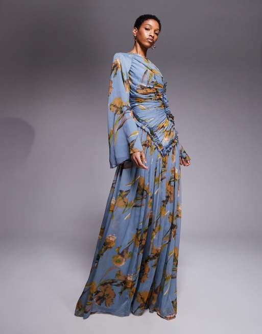 Vestido largo azul con estampado floral, detalles fruncidos y volantes pequeños de chifón efecto arrugado de ASOS DESIGN Tall