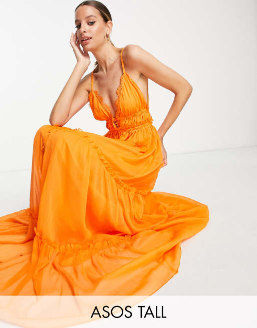 Vestido largo naranja escalonado con botones y detalle de ribete de encaje de ASOS DESIGN Tall