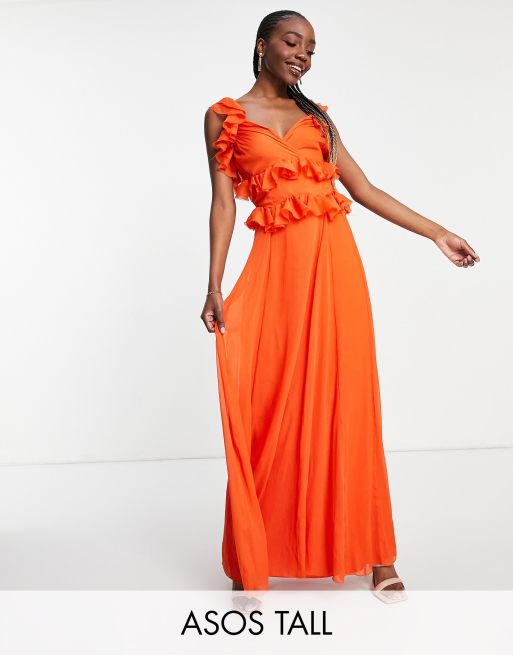 Vestido largo naranja escalonado con volantes y espalda anudada de ASOS DESIGN Tall