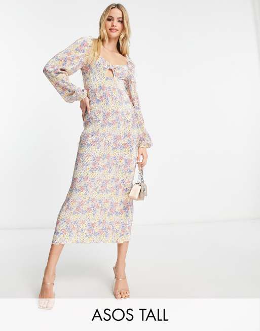 Vestido midi azul plisado de manga larga con estampado de florecitas y detalle en el pecho de ASOS DESIGN Tall