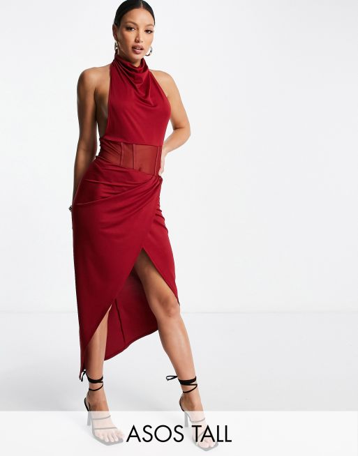 Vestido midi burdeos con diseño de corsé y cuello desbocado de malla de ASOS DESIGN Tall