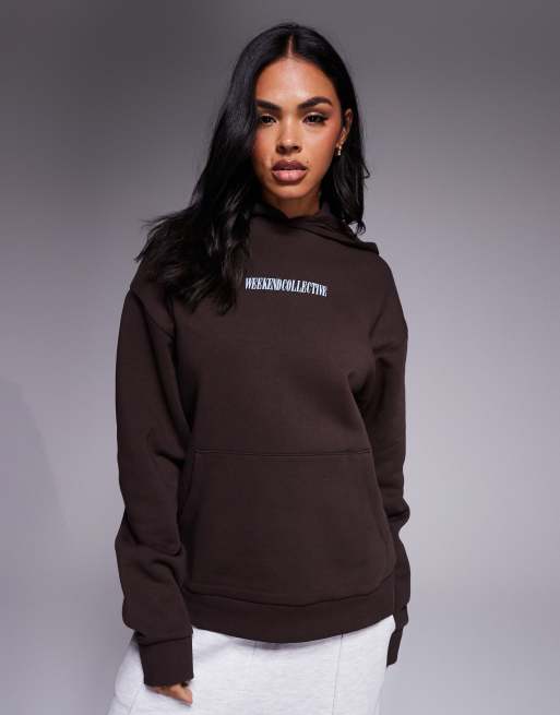 Sudadera marrón chocolate extragrande con capucha y logo apilado en la espalda de Weekend Collective