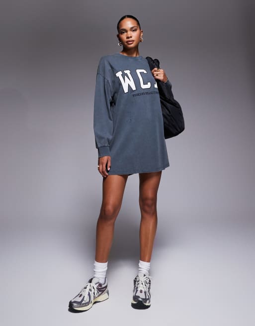 Vestido camisero gris carbón lavado extragrande de manga larga con logo universitario Icon de Weekend Collective