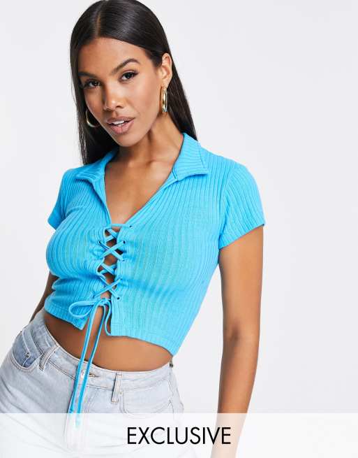 Top azul aguamarina con solapas estilo polo y cordones de canalé de ASYOU