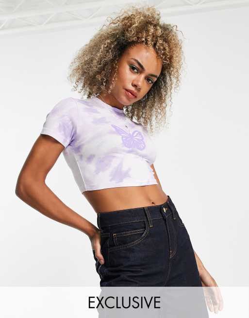 Top corto violeta con efecto tie dye y estampado de mariposas de ASYOU