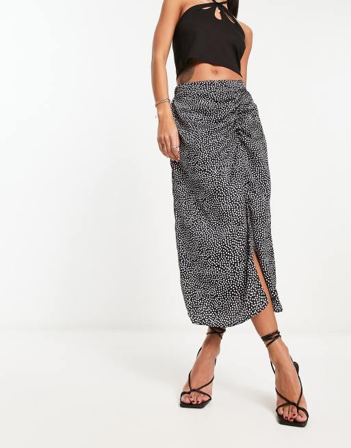 Falda midi negra fruncida con estampado de lunares blancos y abertura delantera de AX Paris