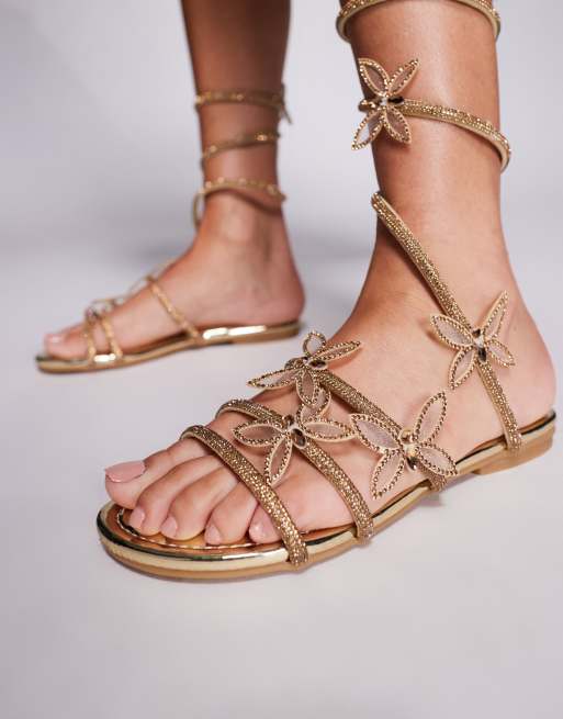 Sandalias planas doradas con diseño en espiral y detalle de mariposas adornadas de Azalea Wang