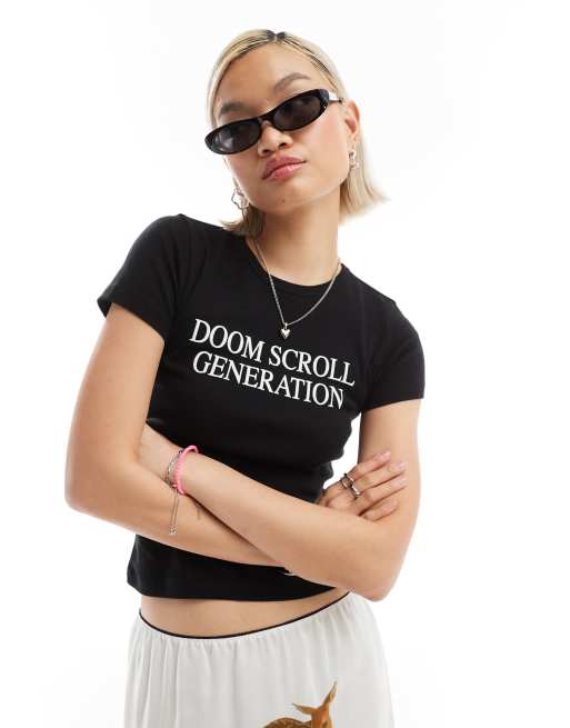 Camiseta negra con diseño encogido y estampado "Doom Scroll" de Basic Pleasure Mode