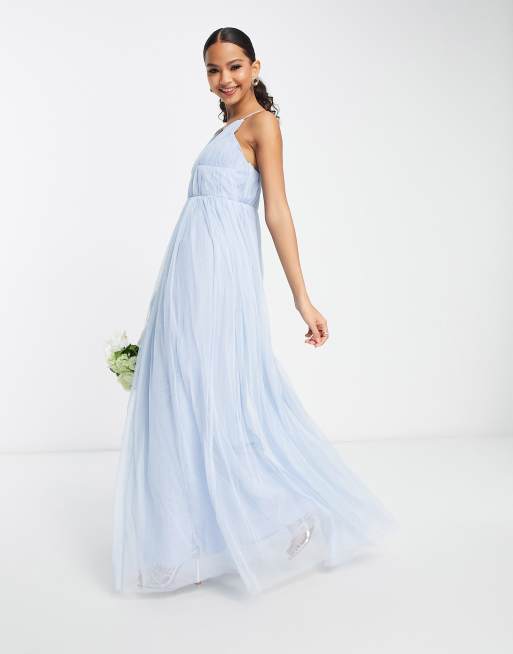 Vestido de dama de honor largo azul claro con diseño de capas de tul de Beauut