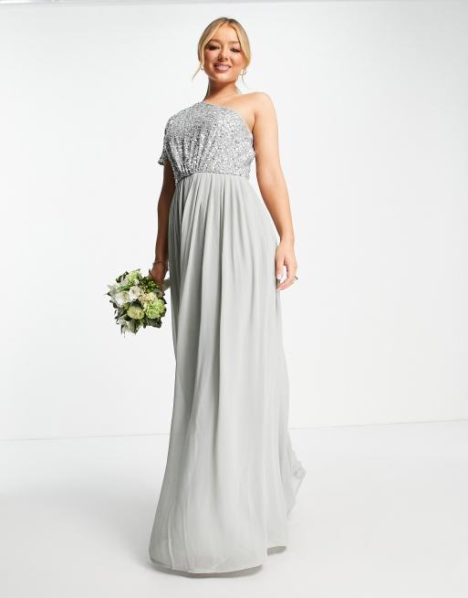 Vestido de dama de honor largo gris asimétrico con corpiño adornado de Beauut